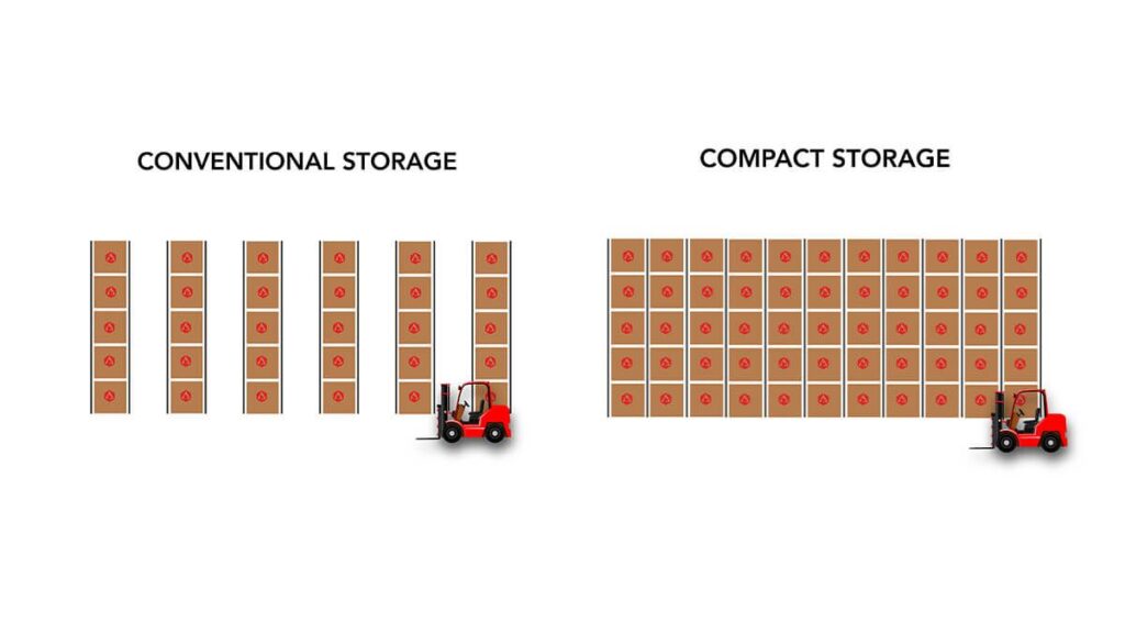 Both systems are designed to increase pallet storage density by reducing the number of aisles in a warehouse.